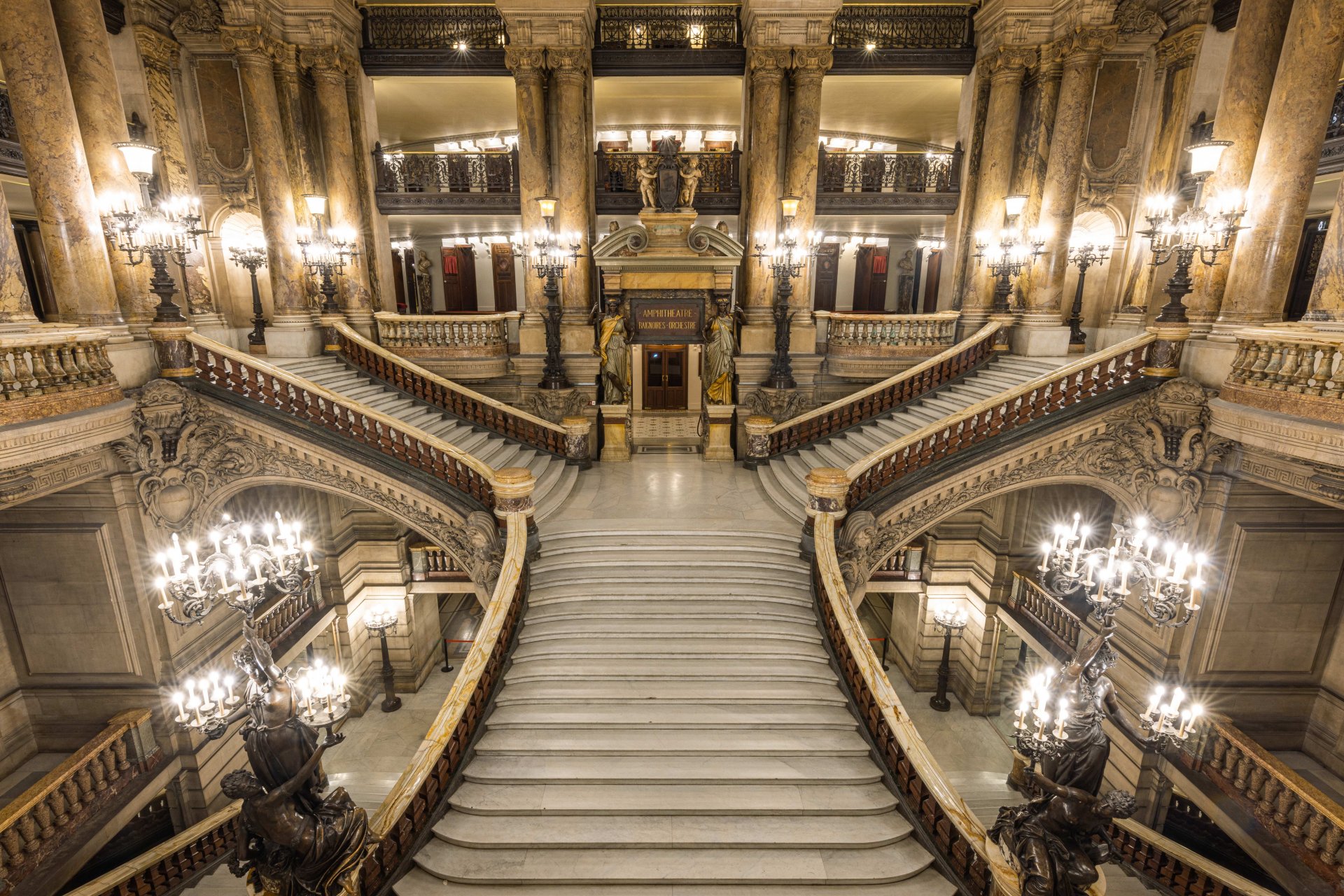 Vous emprunterez le Grand Escalier pour découvrir la somptueuse nef haute de 30 mètres et bâtie en marbre de plusieurs couleurs. La visite se poursuit par le foyer, la salle de spectacle et son plafond commandé par Malraux et peint par Marc Chagall, le salon du Glacier terminé après l’ouverture du Palais Garnier, et caractéristique de l’esthétique de la Belle Époque.